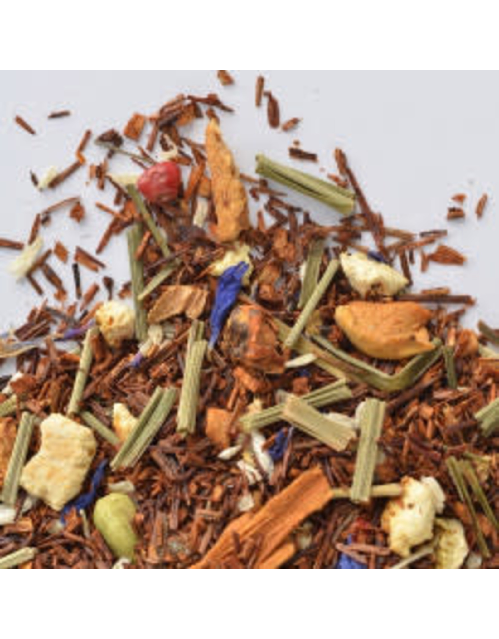 Ingrédients : Rooibos, éclats de pomme, d'orange et de pamplemousse (saveur), cannelle, gingembre, cardamome, noix de coco, citronnelle, poivre rose, centaurée et groseille.